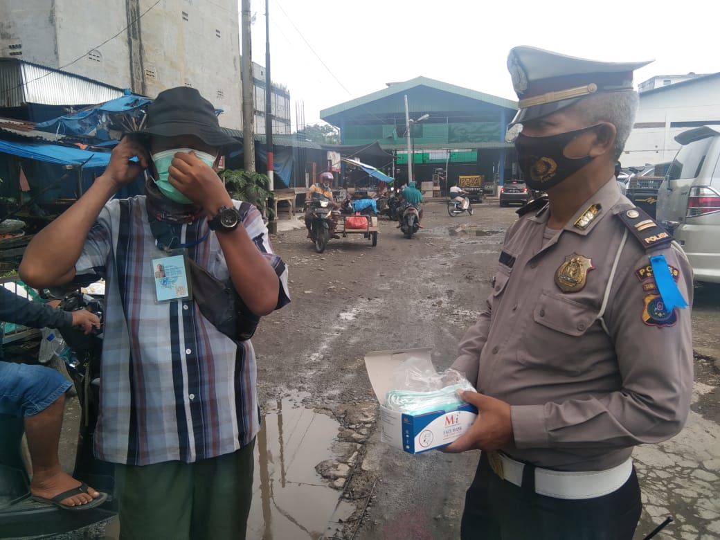 Personil juga membagikan sebanyak 250 Pcs masker kepada masyarakat pengguna jalan.