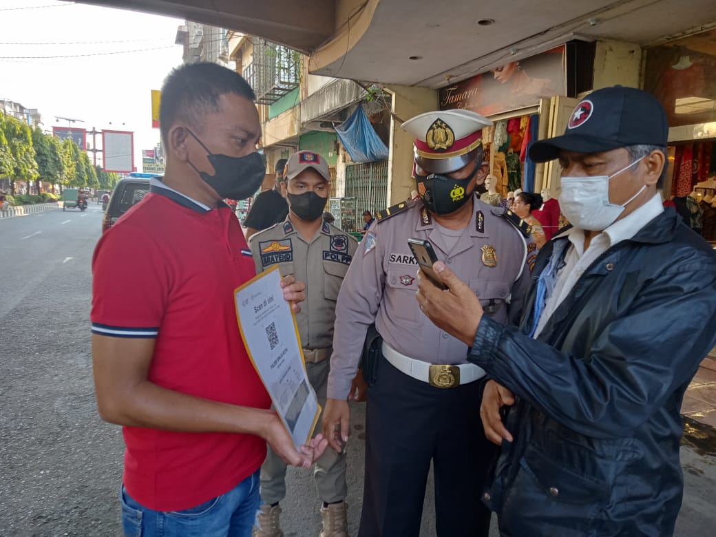 Pada pelaku usaha di Jl. Jend Sudirman Kel. Pekan Binjai Kec Binjai kota agar tetap mematuhi protokol kesehatan dan Melaksanakan pemeriksaan hasil vaksinasi melalui aplikasi Peduli Lindungi terhadap warga masyarakat dengan system Rik Barcode, sebanyak 40 orang dengan hasil hijau, Selama kegiatan berlangsung situasi aman dan baik.