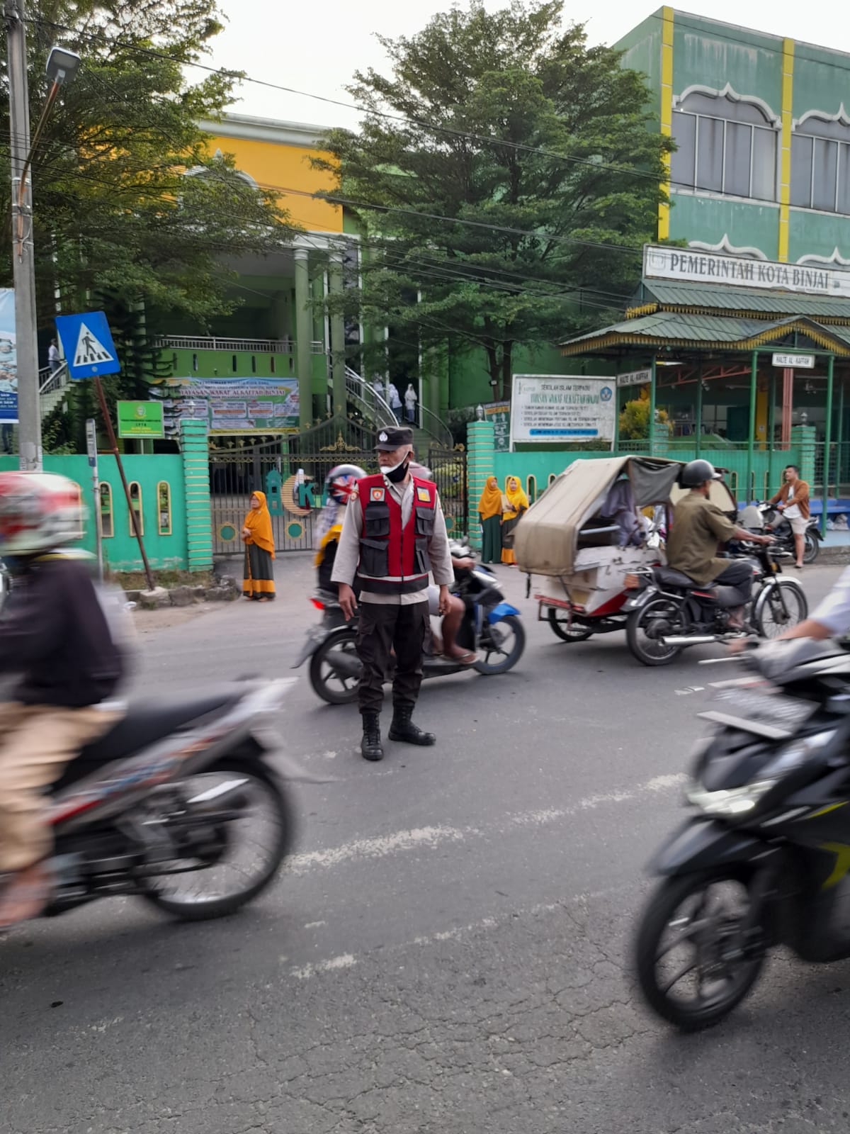 Polres Binjai. – Personil Polsek Binjai Selatan Aiptu IM. Ginting memberikan pelayanan prima kepada masyarakat khususnya bagi pelajar dengan melakukan Pengaturan lalulintas di depan YAYASAN AL-KAFFAH, Rabu (10/8) pagi.