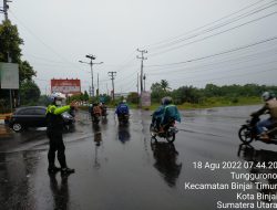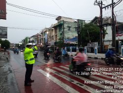 Kota Binjai, – Hujan deras yang mengguyur wilayah Binjai dan sekitarnya, tidak menyurutkan semangat Satuan Lalu Lintas (Sattlantas) Polres Binjai untuk menertibkan kendaraan yang berlalu lintas.
