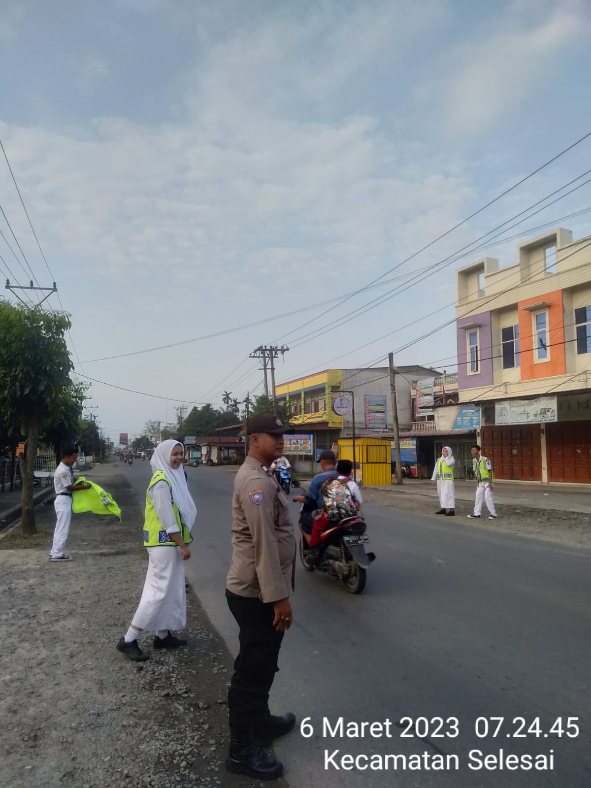 Personil Polsek Selesai melaksanakan pengaturan arus lalin di Yayasan Esa Prakarsa Stabor Kel.Pekan Selesai Kec.Selesai Kab.Langkat , untuk melayani masyarakat dan anak anak sekolah yang menyeberang jalan beraktifitas di pagi hari, agar tidak terjadi laka lantas mengingat di pagi hari mobilitas kendaraan di jalan raya mulai meningkat.