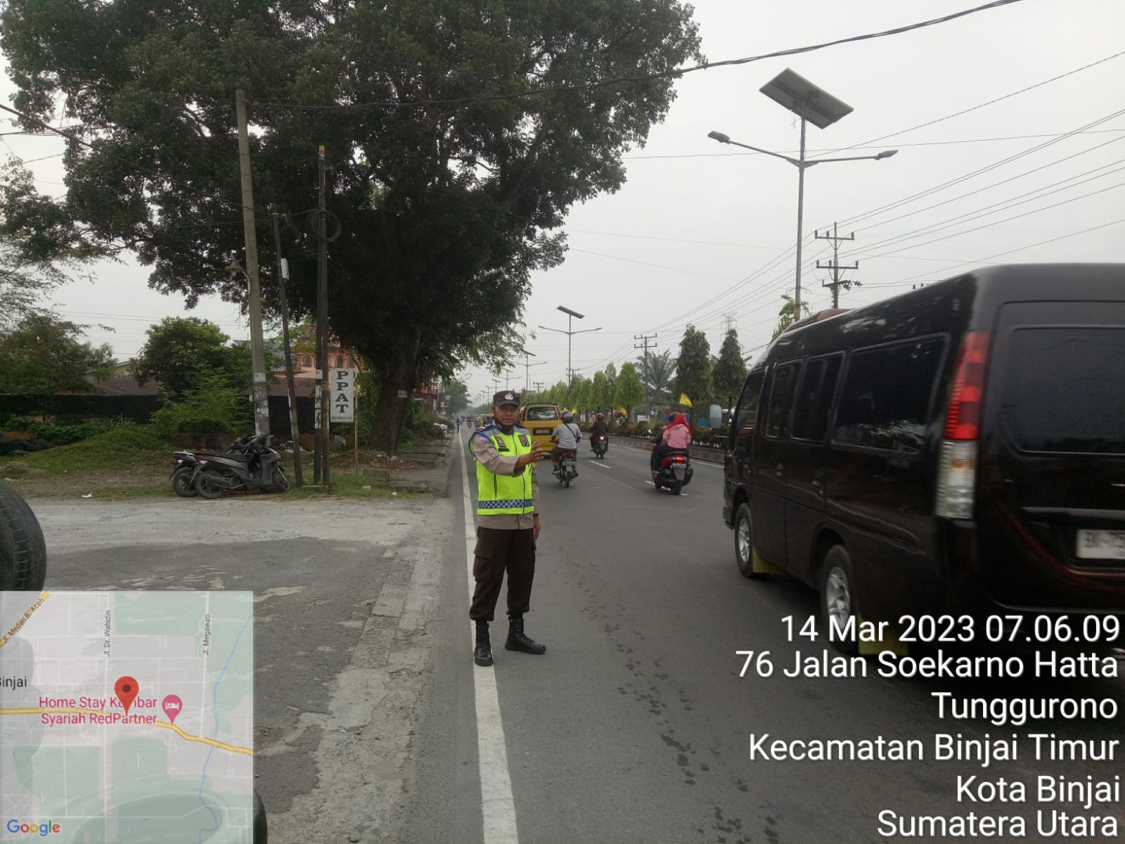 Bertempat di Jl. Soekarno Hatta Km.18.5 Kel. Tunggurono Binjai Timur personil Bhabinkamtibmas Kelurahan Mencirim Aiptu SURADIYANTA melakukan pengaturan arus lalin serta Pemantauan Situasi, guna wujudkan rasa aman dan lancar bagi pengemudi kendaraan, Selasa (14/03/2023) pagi.