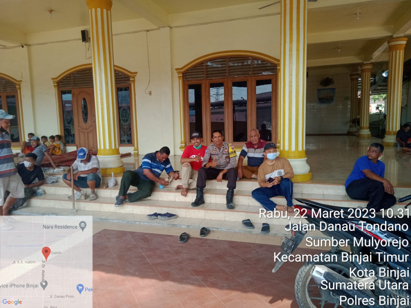 Polres Binjai | Demi terciptanya Harkamtibmas Bhabinkamtibmas Kelurahan Sumber Mulyorejo Aipda Kiki Surya Syahputra menyambangi Warga yang sedang memulai aktivitas gotong royong di Masjid Nurul Hidayah Jl.Danau Tondano Lk.8 Kel. Sumber mulyo Rejo Kec.Binjai Timur. Rabu 22 maret 2023.