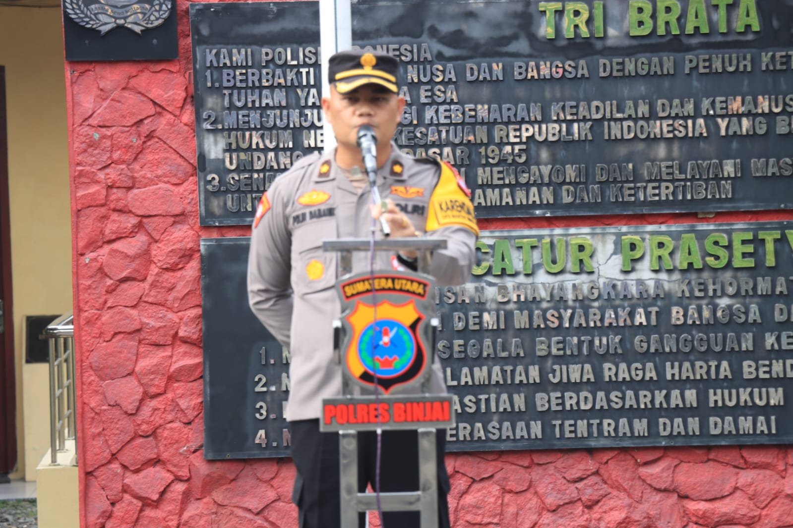 Kabag Ops selalu Karendal Operasi Mantap Brata Toba 2023-2024, memberikan arahan kepada personil yang terlibat dalam pengamanan pendaftaran capres/cawapres 2023, dilapangan apel polres Binjai, Senin 23/10/2023,