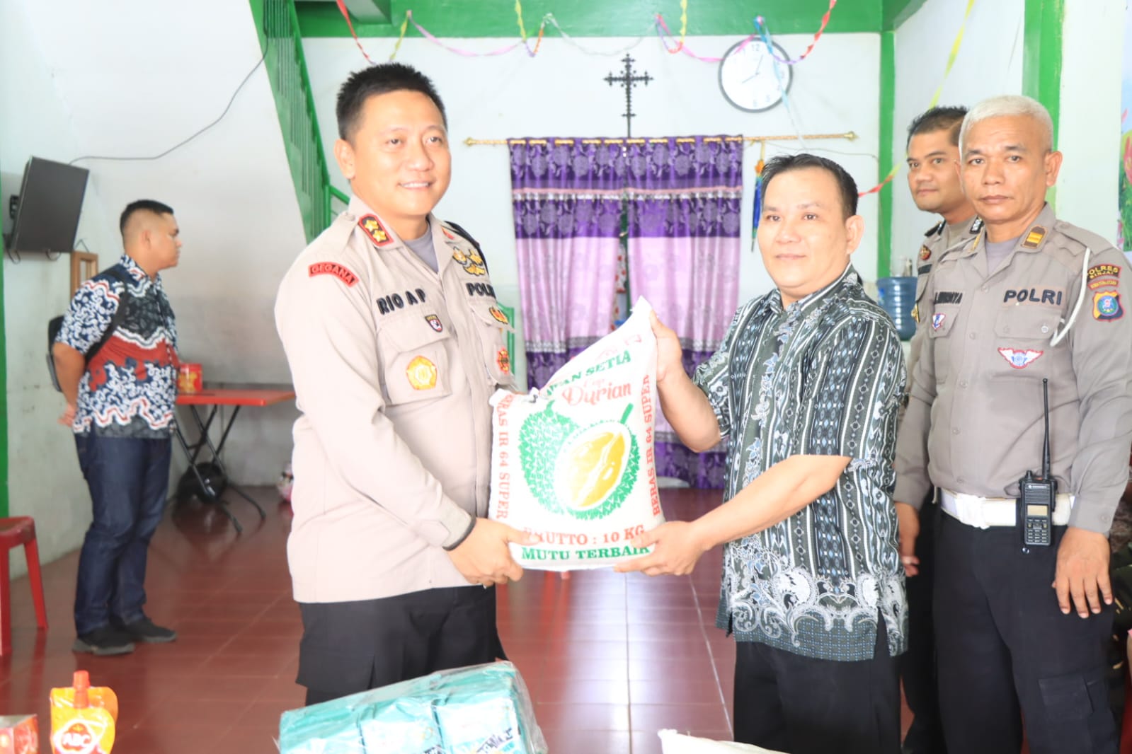 Adapun yang hadir disaat pemberian baksos tersebut yaitu ; Kapolres Binjai AKBP RIO ALEXANDER PANELEWEN, S.I.K, Ketua panitia Natal Kompol Polin Benhod Damanik, SH, Ketua seksi sosial Akp Agus Ita Lestari Ginting, S.I.K., M.Si., dan personil polres binjai.