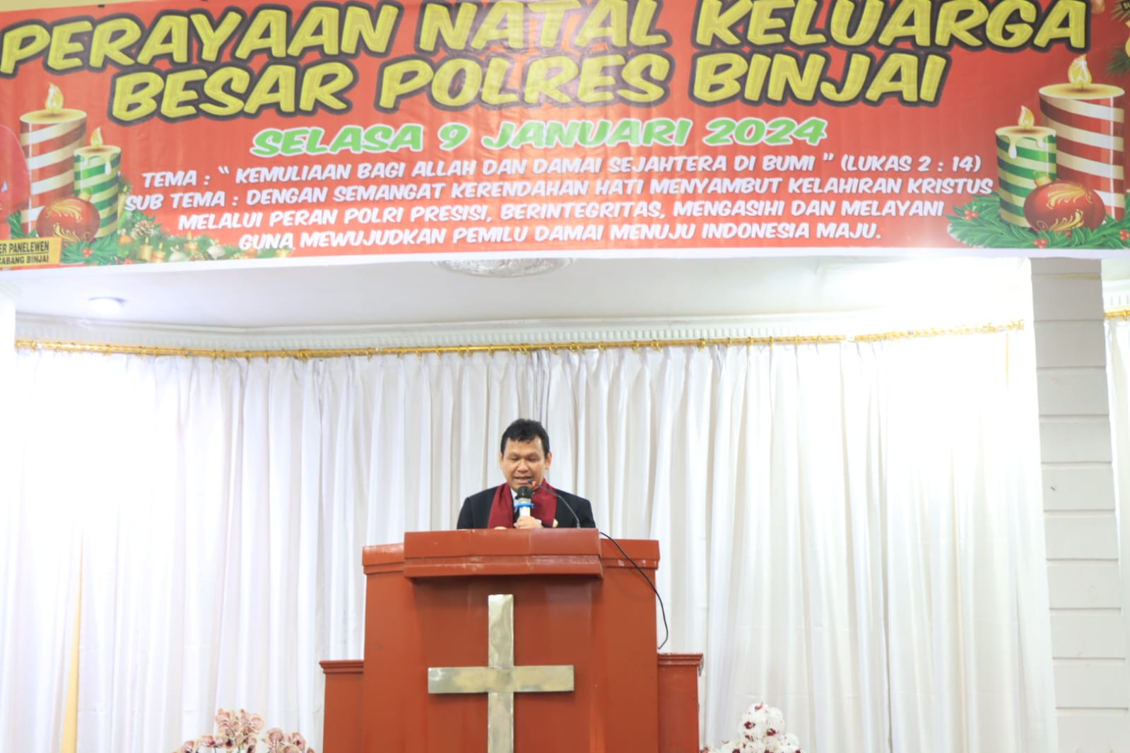 Sebagai pembawa renungan Natal polres Binjai tahun 2023 yaitu Pdt. Ishak Kusno, dengan Tema : “Kemuliaan Bagi Allah dan Damai Sejahtera di Bumi (Lukas 2:14)” dan Sub Tema : “Dengan semangat kerendahan hati menyambut kelahiran Kristus melalui peran Polri presisi, beritegritas, mengasihi dan melayani guna mewujudkan Pemilu Damai Menuju Indonesia Maju”,