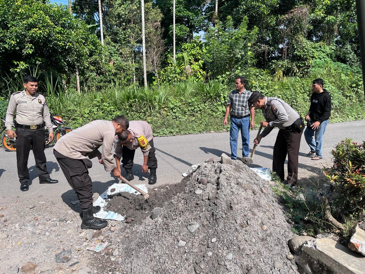 Sei Bingai | Langkat,- Polsek Sei Bingai Jajaran Polres Binjai Polda Sumut bersama Pemerintah Desa Gunung Ambat dan masyarakat gotong royong menimbun lubang di sepanjang jalan yang menghubungkan Desa Gunung Ambat dengan Desa Simpang Kuta Buluh. Kamis,21 Maret 2024. 09.00 WIB.