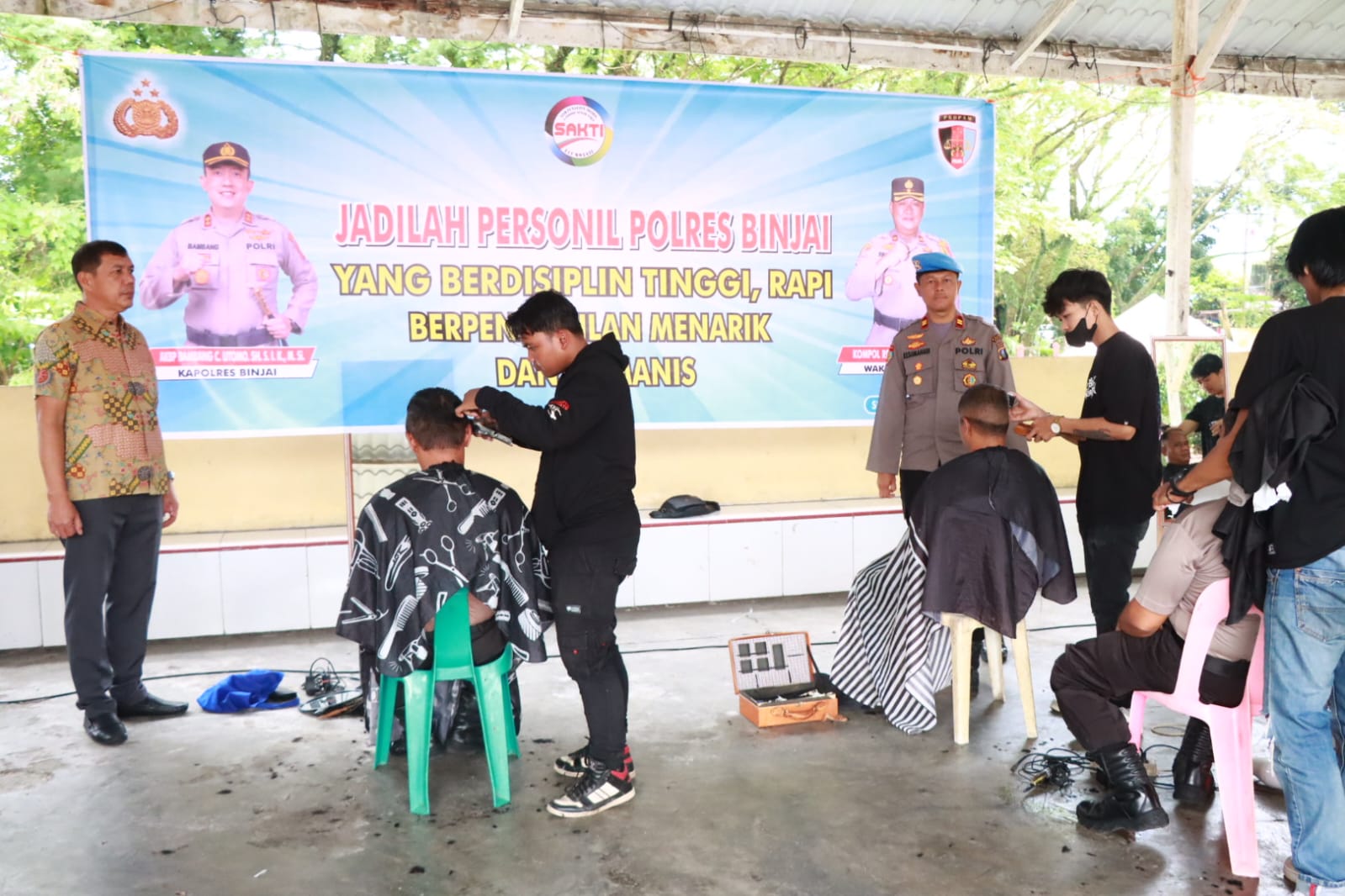 BINJAI /- Kapolres Binjai Akbp Bambang C. Utomo, S.H., S.I.K. M.Si., siapkan tukang pangkas gratis terhadap personil polres Binjai, di lapangan parkiran polres jalan sultan hasanuddin No.1 Binjai, provinsi sumatera utara, Rabu (28/8/24) mulai pukul 09.00 wib setelah selesai melaksanakan apel pagi.