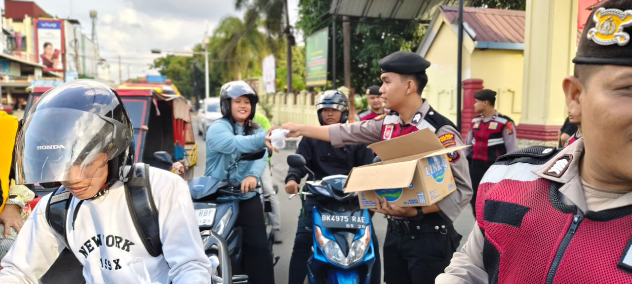 Binjai- Polres Binjai Membagikan takjil gratis. Sasarannya adalah para pengguna jalan dan warga yang melintas di hari ini Kamis sore 27/03/25 didepan mako polres binjai jalan sultan hasanuddin kecamatan binjai kota,