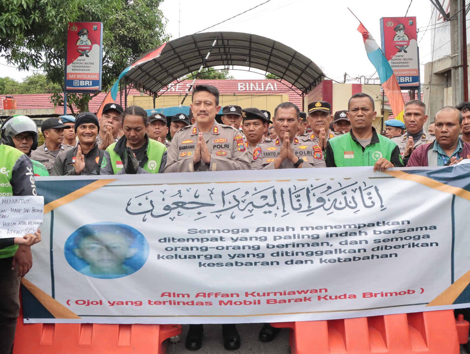 Kedatangan ratusan driver ojek online (ojol) ke polres Binjai untuk menggelar aksi damai. Aksi ini menjadi bentuk penghormatan terakhir bagi almarhum Affan Kurniawan, driver ojol yang meninggal setelah terlindas mobil barakuda Brimob.